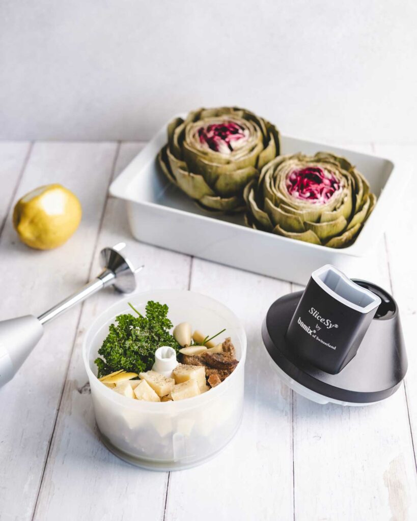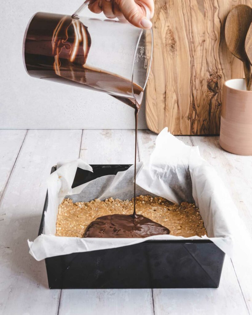 - Smelt de chocolade in een kannetje en doe er de kokosolie bij. Meng met het mes van de bamix op snelheid 1. Giet de chocoladesaus over de pindakaaspasta en laat ze hard worden.