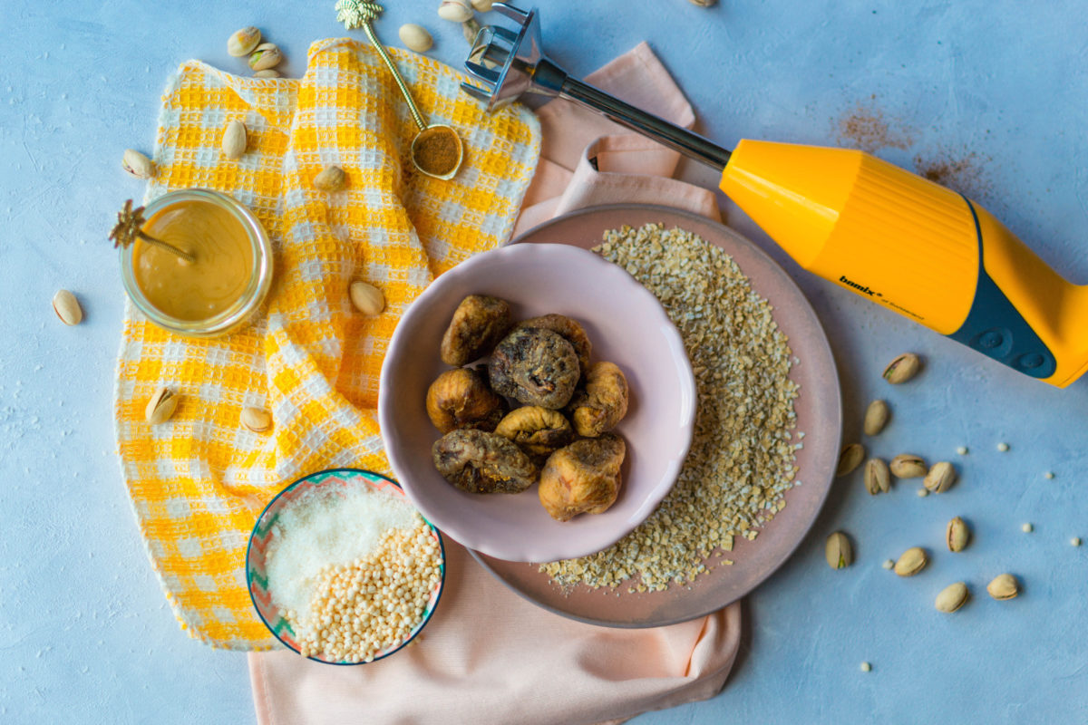 Snackbolletjes met vijgen, havermout, gepofte quinoa, kaneel, pindakaas en pistachenoten.