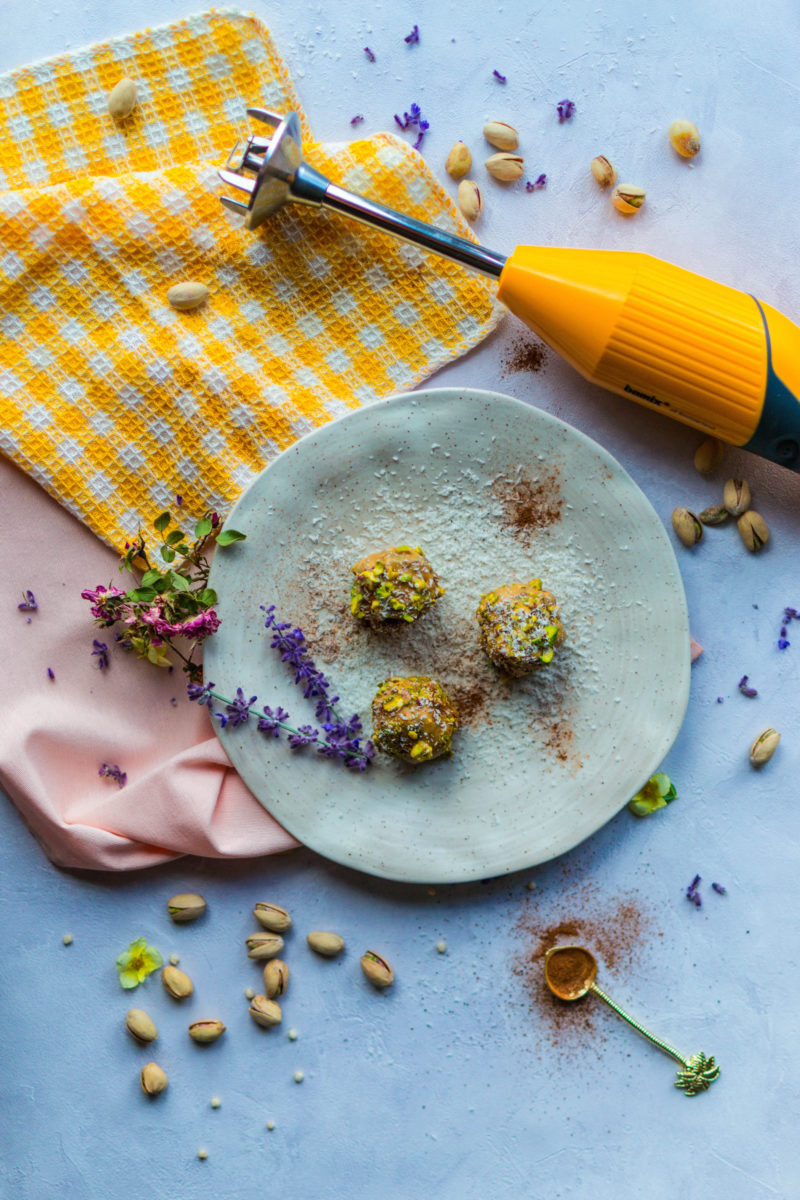 6 Rol de balletjes in de pindakaas en rol ze dan door de pistachenoten.