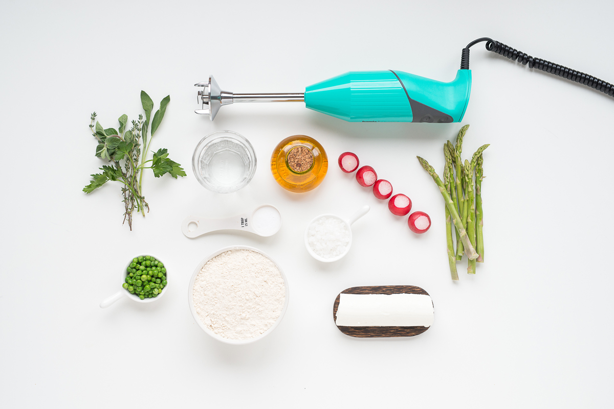 2 Meng de speltbloem, het bakzout en zout in een kom. Voeg water en olijfolie toe en meng het geheel met het bamix multimesje.