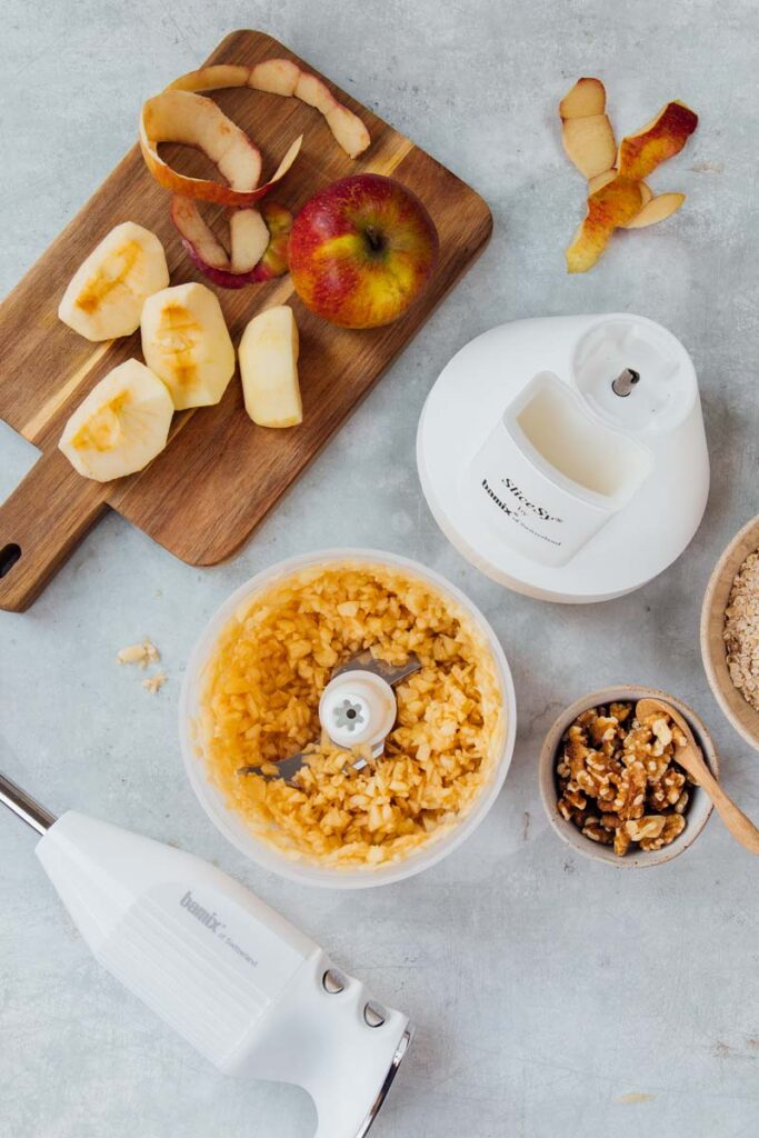 - Préchauffez le four à 200 °C (chaleur tournante). Épluchez les pommes, coupez-les en petits quartiers et mélangez-les avec la cannelle. Dans le SliceSy® équipé du couteau hachoir, mettez la farine, le sucre et une pincée de sel et mixez brièvement. Coupez le beurre en petits cubes et ajoutez-le dans le SliceSy®, puis pulsez jusqu’à obtenir une pâte sablée.