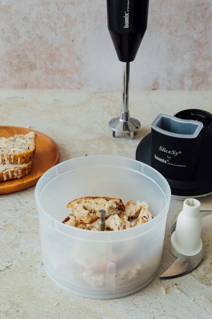 - Pendant ce temps, préparez les croûtons. Placez les tranches de pain dans le SliceSy® muni du couteau hachoir et hachez grossièrement. Faites chauffer un généreux filet d’huile d’olive dans une poêle et faites dorer le pain jusqu’à ce qu’il devienne croustillant. Salez légèrement.